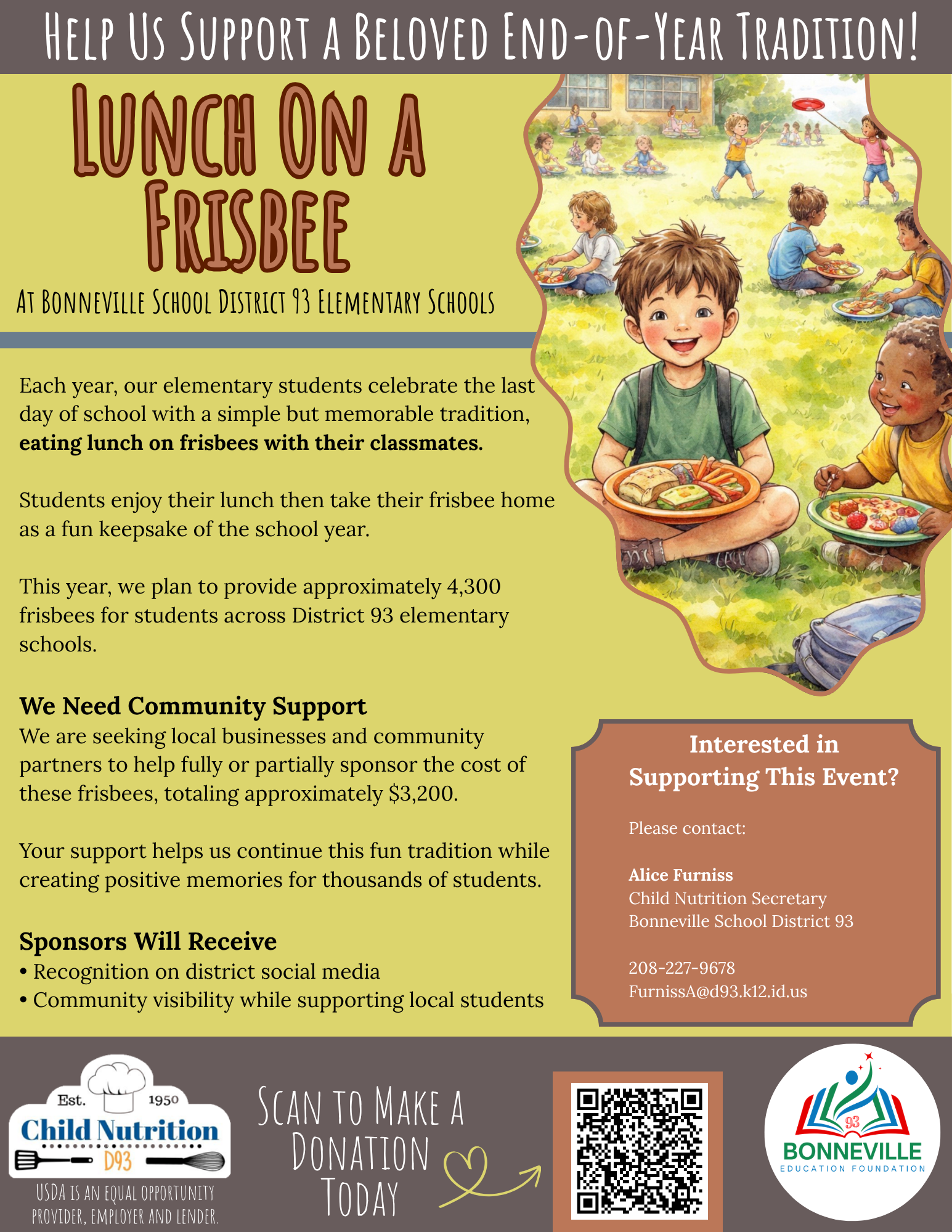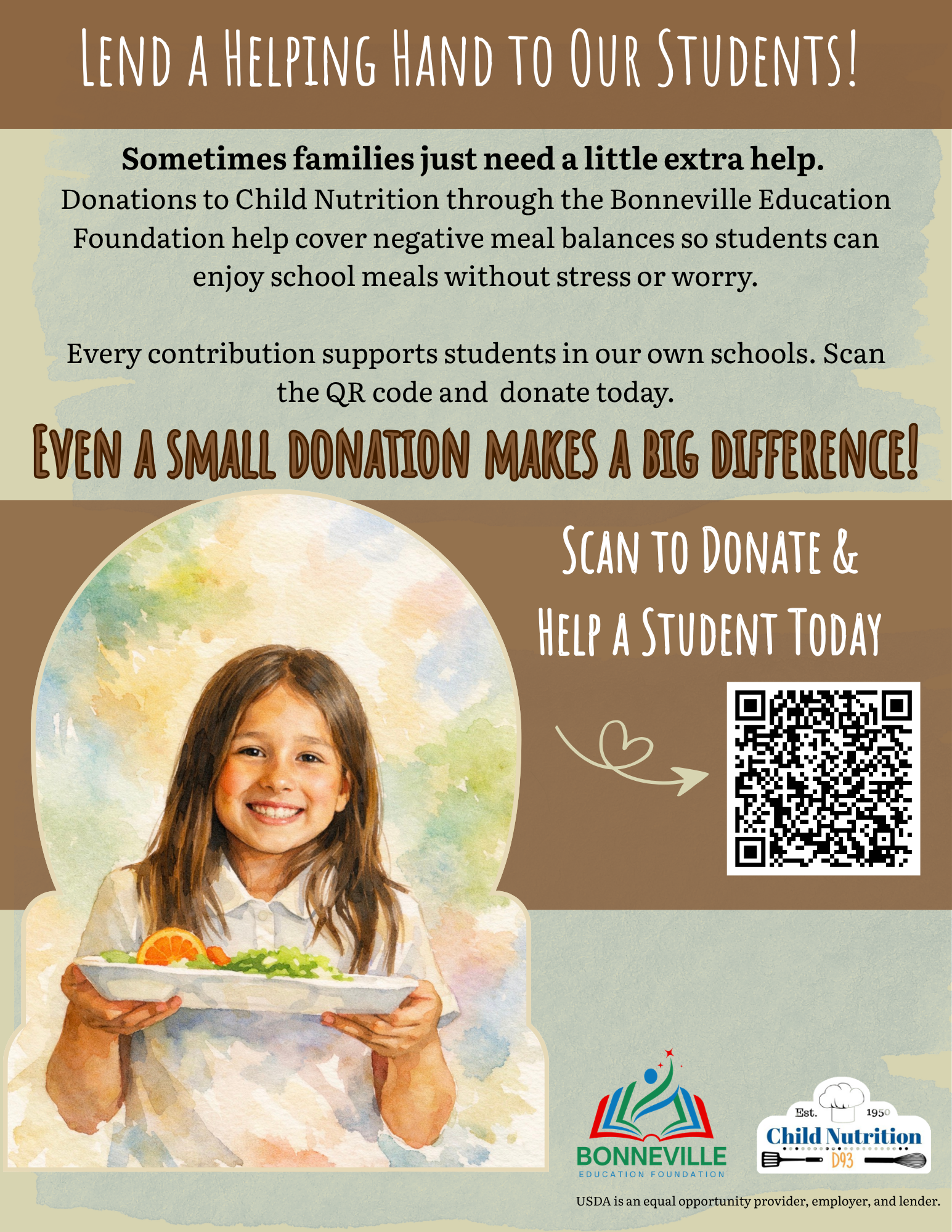 The Bonneville Education Foundation partners with Bonneville School District 93 Child Nutrition to ensure that every student has access to meals and positive experiences surrounding school nutrition.